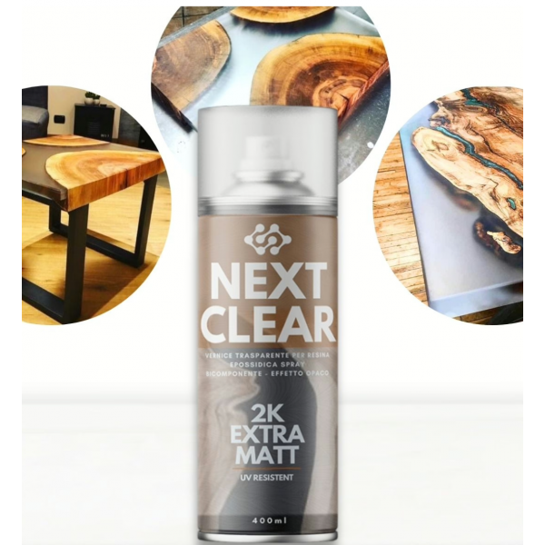 NextClear es el barniz profesional de dos componentes. NextClear mate se presenta como un transparente 2k de alto sólido la mejor solución para realizar un retoque de mesa con aerosoles: de hecho, la propiedad de alto sólido le da una alta resistencia y la propiedad, dos Características fundamentales para resinas y madera.